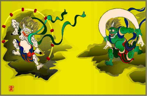なお脚色が為されても、御祭神を崇敬する心情は、自由な真心の問題で、御祭神を崇敬する“ひと”や“人”の真心が有る以上、御祭神の本義から逸脱する事は無い。 (雷神と風神)