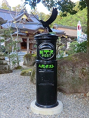 ☆ 本宮大社には昔懐かしい丸型ポストが設置されていて、そのポストは見慣れた赤いポストではなく、黒くて上に八咫烏の勿桍殉が乗っていて、「八咫烏ポスト」の名前がつけられている。